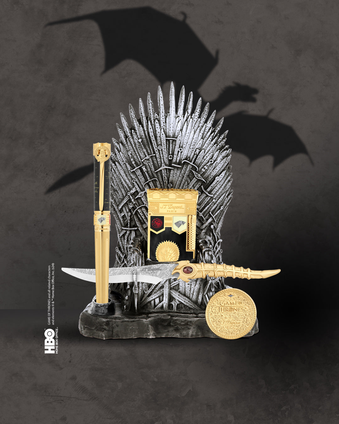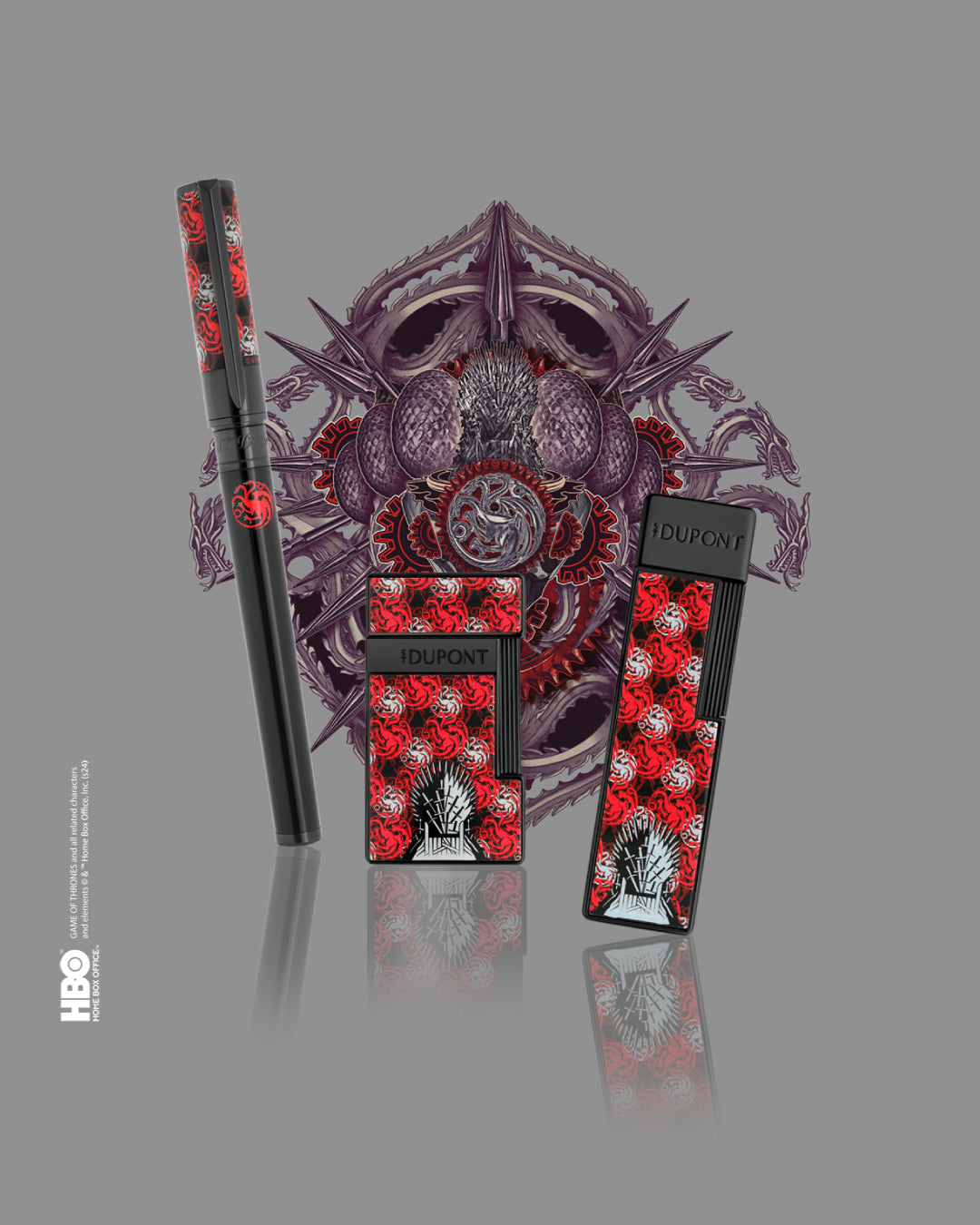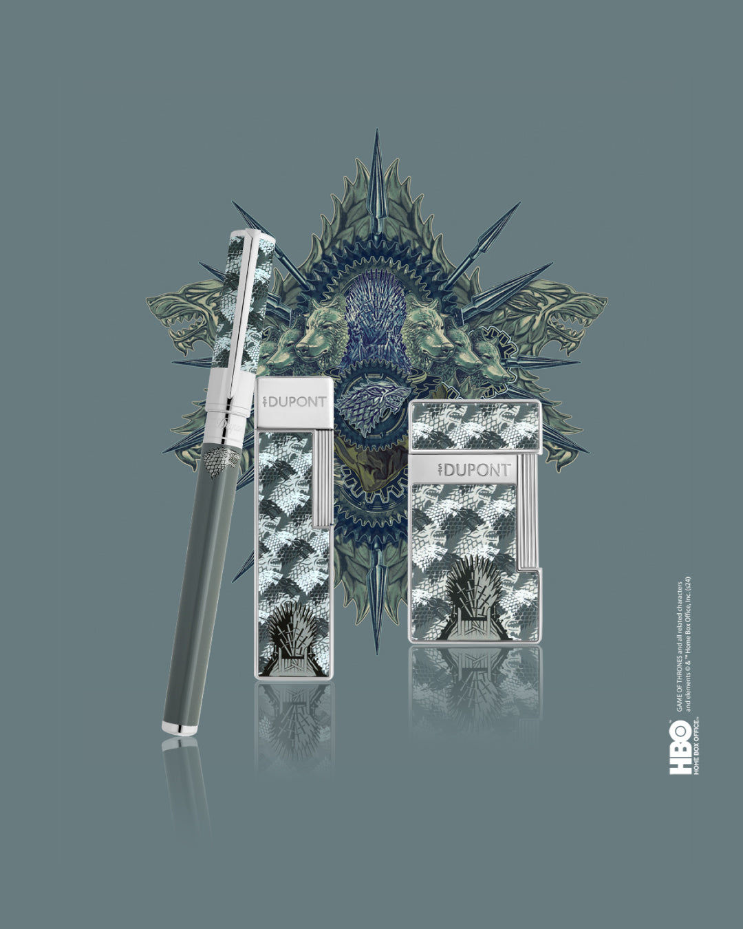 "Game of Thrones x S.T. Dupont" incarnant la volonté de ceux qui tracent leur propre histoire, cette collection donne vie aux thèmes qui la traversent. Au savoir-faire S.T. Dupont, aussi. L’art du feu, de l’écriture et la maîtrise orfèvre de la maison s’expriment dans sa très luxueuse interprétation du Trône de Fer ou des iconiques dragons.